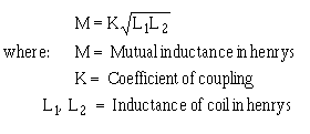 The mutual inductance between two coils, L1 and L2, is expressed in terms of the inductance of each coil and the coefficient of coupling K. As a formula: