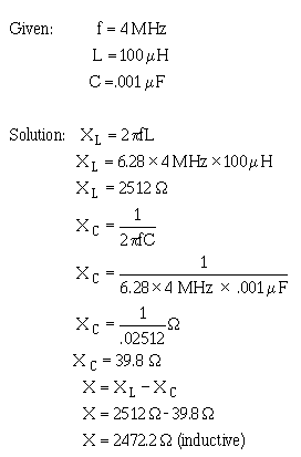 For a practical example, suppose you have a circuit containing an inductor of 100 mH in series with a capacitor of .001 mF, and operating at a frequency of 4 MHz. What is the value of net reactance, or X?